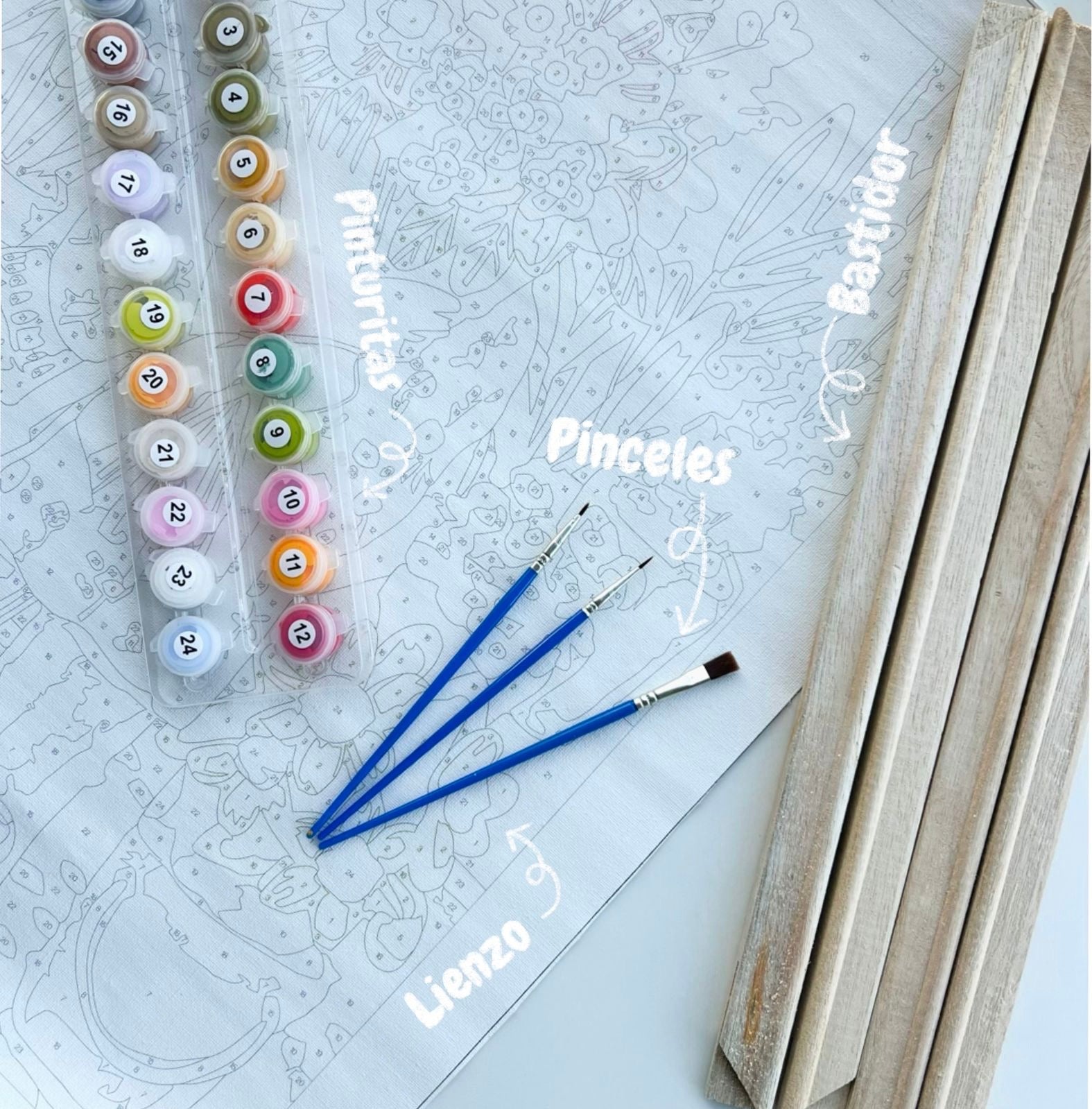 - Kit de pinturas acrÃlicas con número indicado.
